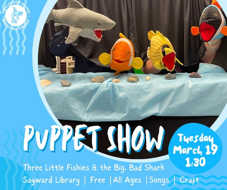 Puppet Show: Three Little Fishies and the Big Bad Shark 0 comments The Sayward branch of Vancouver Island Regional Library is hosting a children and family friendly puppet show on Tuesday, March 19th. from 1:30pm – 2:30pm. After the puppet show, there will be songs, crafts and a scavenger hunt. Submit a Comment Cancel replyYou must be logged in to post a comment.